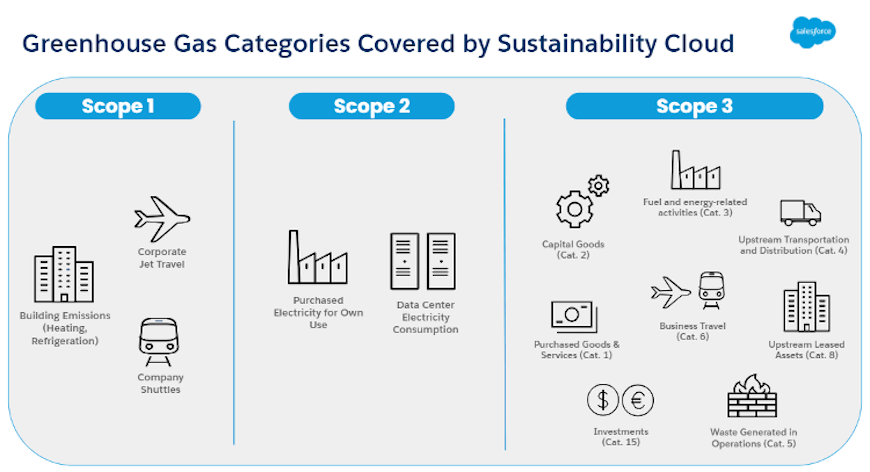 Scope 3 emissions in Salesforce Sustainability Cloud are captured and visualized within the same platform that currently calculates scope 1 emissions (the direct emissions from owned and operated assets), and scope 2 emissions (those associated with the purchase of electricity, heat, or cooling for a company’s own use). This provides a single source of truth for emissions data.
