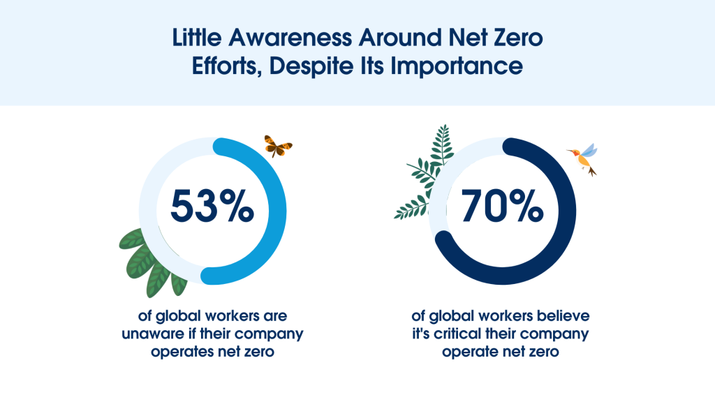 Looking further into the data, a clear knowledge gap is uncovered. Over half of surveyed workers are not aware if their company operates with net zero emissions, despite 70% saying it is critical that their company does so – making it clear there is a need not just for skilling, but for ensuring overall education for employees around company sustainability commitments and climate goals. In fact, over one-fourth of the 1,297 workers surveyed around the world have never even heard of a Carbon Accountant.