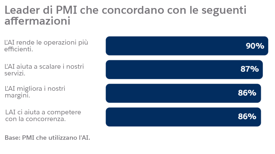 Secondo l’ultimo report “Piccole e medie imprese: i trend principali” di Salesforce, il 78% dei leader delle PMI afferma che l’AI rivoluzionerà le loro funzioni operative aziendali. Per una PMI, ogni ora e ogni euro contano: ecco perché una strategia AI ponderata diventa il tuo vantaggio competitivo. Se efficace, la tua strategia AI porta a risultati come i seguenti: