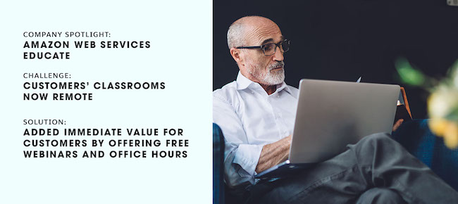 Ciò che non consiglio è l’invio di e-mail in massa a ogni contatto nel vostro database senza alcuna personalizzazione, valore o informazione. Al contrario, date un’occhiata ai vostri clienti: esaminate quelli esistenti e continuate a vendere in maggiore quantità ciò che avete già venduto. Inventatevi soluzioni creative per interagire. Di recente, Amazon Web Services Educate ha iniziato a offrire webinar gratuiti e consulenze per aiutare i propri clienti a sviluppare nuove competenze mentre università e business school sono chiuse. I clienti esistenti hanno già dimostrato di essere disposti a fare affari con voi. È questo il momento giusto per consolidare il vostro rapporto.