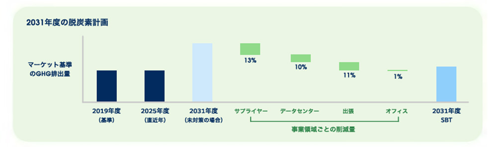 ・短期目標 : 2031年度までにスコープ1・2(自社のオフィスや車両、使用電力などに伴う排出)の総量を2019年度比で67%削減し、スコープ3(その他のサプライチェーン排出量)にあたるの排出原単位を68%削減