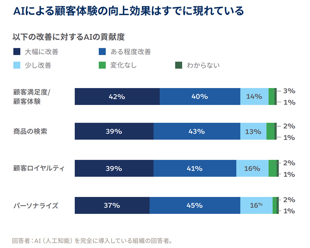Salesforceの調査によると、AIを導入しているコマース組織の82%が「顧客満足度/顧客体験、商品検索においてAIによる改善を実感している」と回答しました。