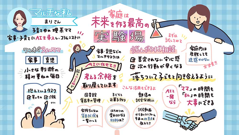 私は「家庭は未来を作る最高の実験場」だと思っています。失敗しても仕事ではないのだからと割り切って、まずは試してみる。その挑戦が、ビジネスだけでなく育児や生活におけるAI活用を広げていく良いきっかけになると感じています。AIは効率化の道具ではなく、暮らしの余白を支えてくれる相棒です。