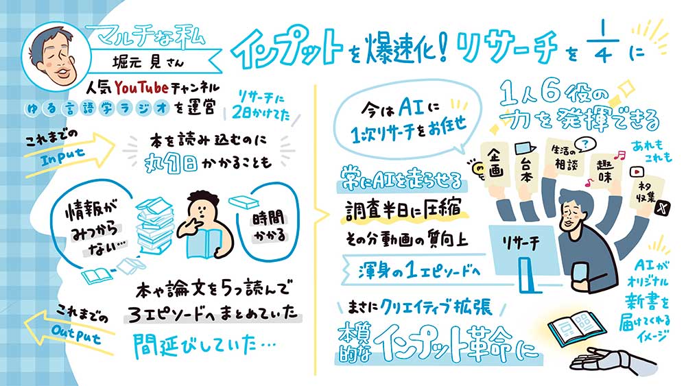 大量のアウトプットを行うためにはもちろんインプットが欠かせず、そのための最大の課題はリサーチでした。本を1冊読み込むのに丸1日かかることもあり、そこが制作のボトルネックだったのです。