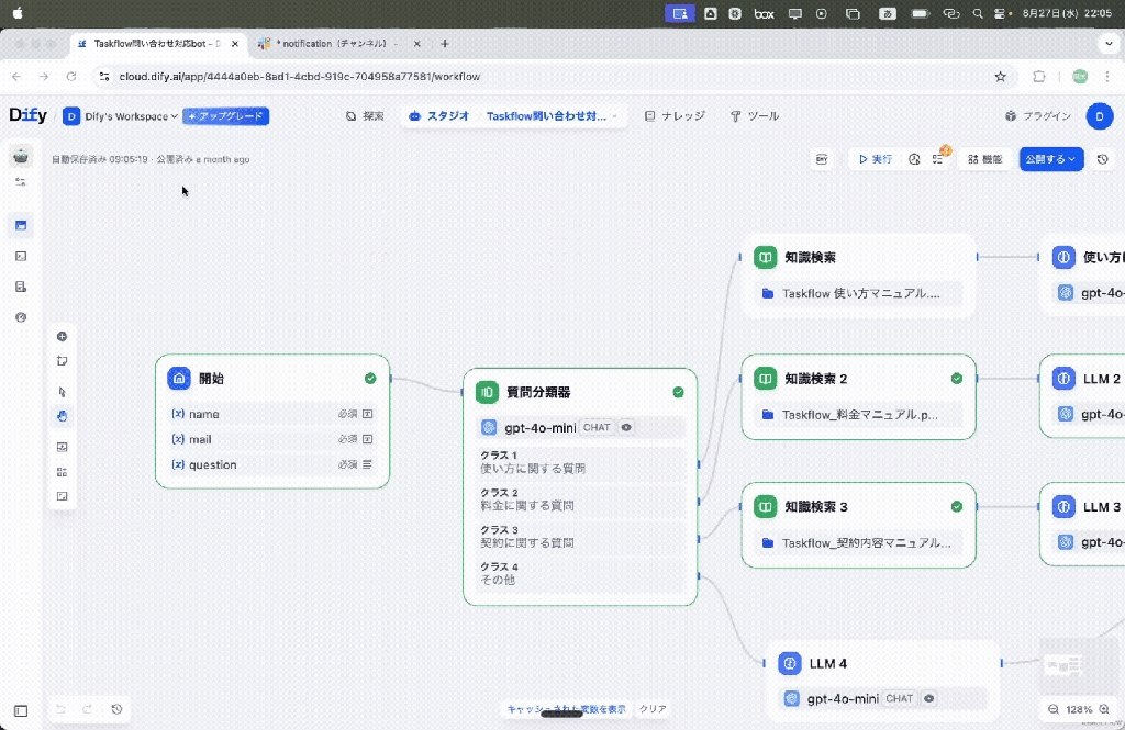 まずユーザーから質問を受けると、その質問の種類をこの「質問分類器」で判定してもらいます。例えば「月額費用を教えて欲しい」という質問なら、「これは費用の質問」とAIが解釈し、料金に関する問い合わせにフローが伸びていきます。