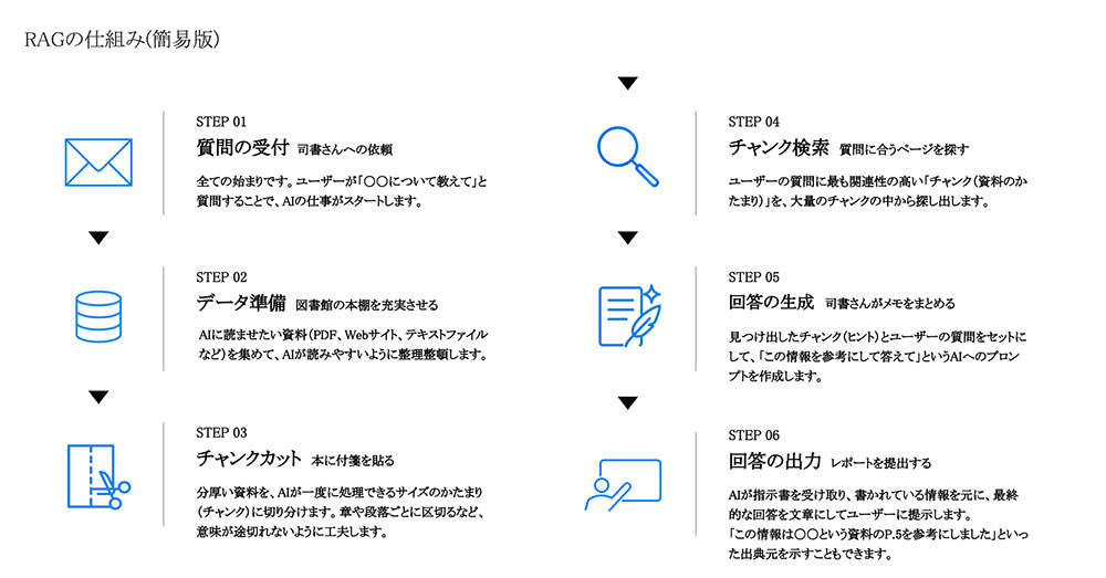 まず、RAGの6ステップというものがあり、それはこちらの図の内容です。