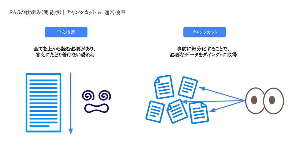 通常の検索と比較すると、こうした違いです。ChatGPTなどに長いドキュメントを読ませたとき、全てのものを上から読んでいくと下のものが読めなくなり、変な答えを返してしまう問題がよく起こりますよね。