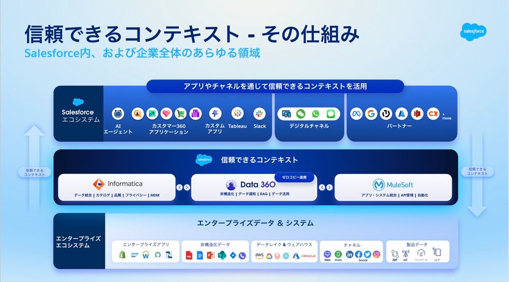 つまり、MuleSoftがデータの通り道を作り、Informaticaがデータの中身を磨き上げる。この2製品がタッグを組んで初めて、Agentforceは会社の事情を完璧に理解したAIエージェントになれるわけです。