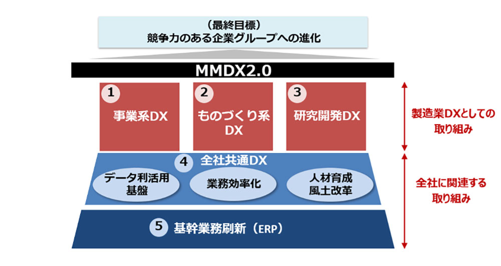 そこでMMDX2.0では、製造業の原点に立ち返って、事業系DX(各事業における競争力向上のための顧客接点強化施策など)、ものづくり系DX(生産プロセスの自動化や環境負荷軽減に寄与するものづくり技術の開発など)、研究開発DX(ノウハウ共有や新素材開発の加速など)の3本柱に再編成しました。
