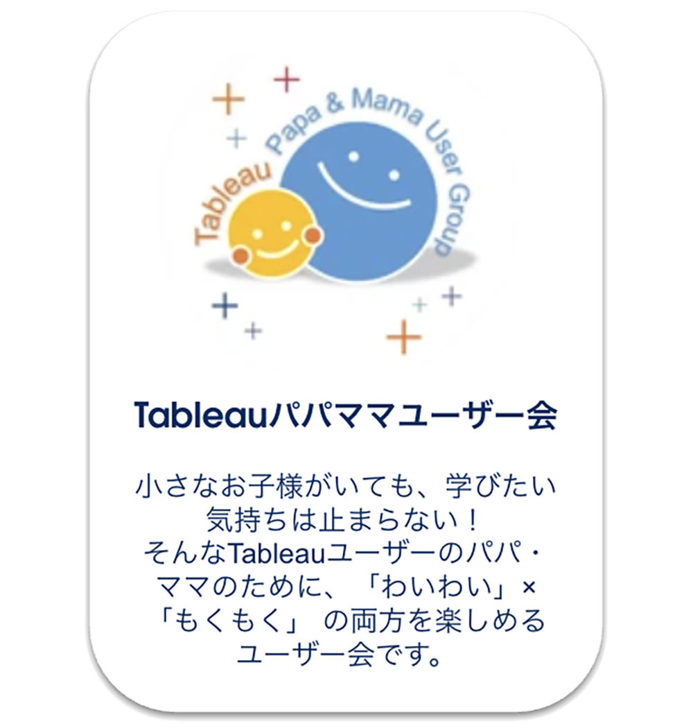 そんなTableauユーザーのパパ・ママのために、「わいわい」×「もくもく」 の両方を楽しめる交流会を開催します。パパ・ママはお互いに情報交換をしたり、集中してTableau学習を進めることができます。お子様は極力運営スタッフで対応をさせていただく予定です。