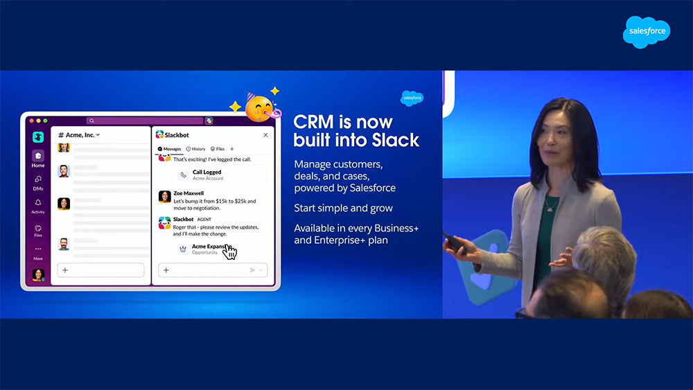 最初の発表は「Slack CRM」です。世界最強の CRM が、シンプルな形でSlackとつながりました。