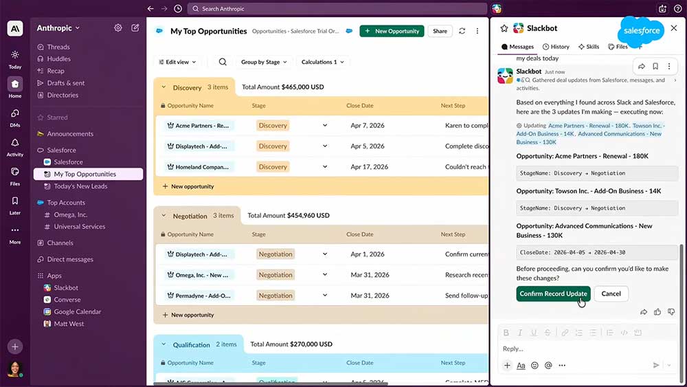 Anthropicの営業チーム全体がSlackとAgentforce を活用。AIエージェントがトップ・オブ・ファネルを押し上げ、プロスペクティングを行い、案件を前に進め、アカウントを成長させる手助けをしています。すべて Slack の中で。その結果として、商談サイクルが60%短縮されました。