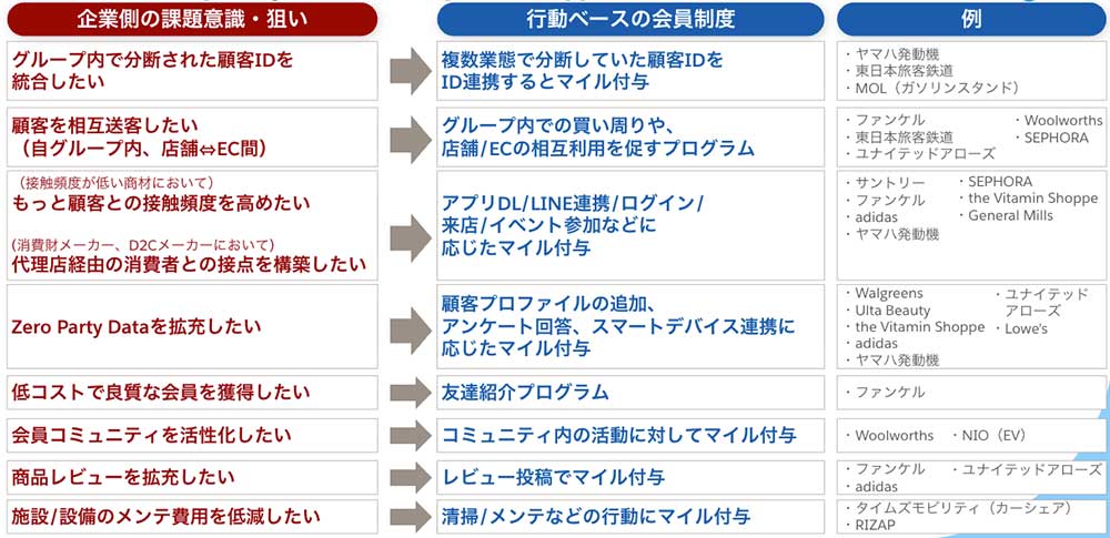 1つ目は、「行動ベースのランク判定/ポイント付与」です。これは、従来の購入金額だけでなく、「アプリへのログイン」や「アンケート回答」、「友達紹介」といった顧客の多様な行動(エンゲージメント)を評価する考え方です。これにより、企業は顧客との接触頻度を高め、購買以外のデータ(Zero Party Data)を拡充できます。