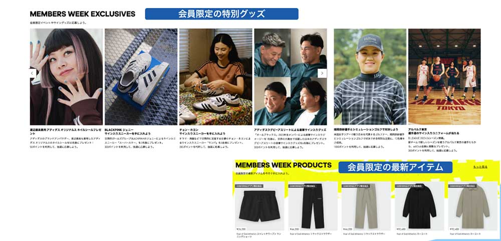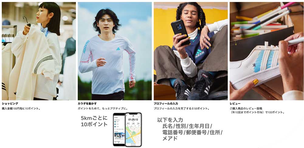 adidasは、ブランドの世界観とロイヤルティプログラムを見事に融合させています。商品購入だけでなく、ランニングアプリの利用(5kmごと=10pt)という「カラダを動かす」こと自体をポイント化。まさに行動ベースのプラクティスを体現しています。