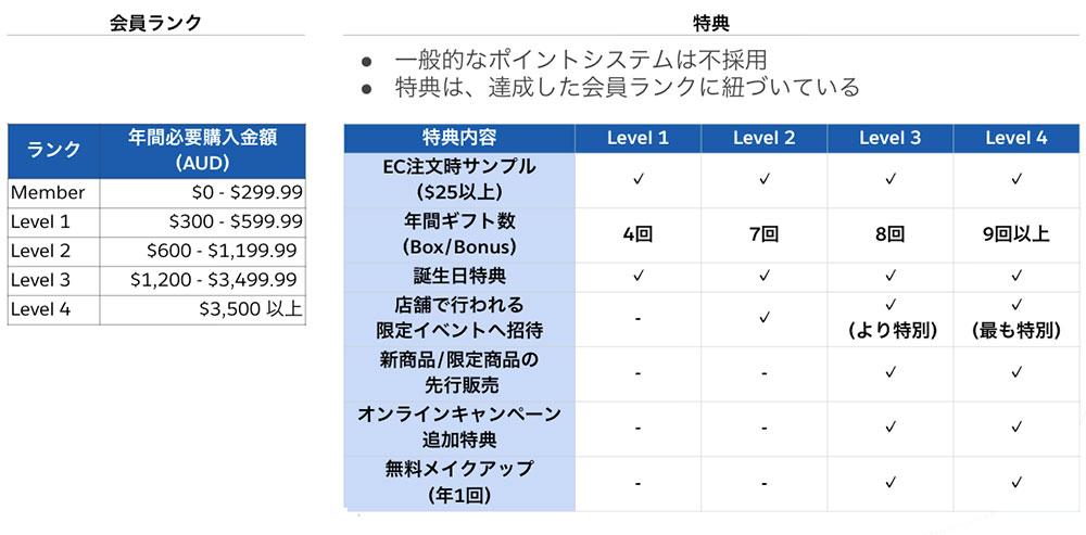 Beauty Loopには、一般的なポイントシステムが存在しません。特典は年間の購入金額に応じて設定される4段階の会員ランクに紐づいており、割引ではなく、特別な体験や限定性(Exclusivity)に重きを置いています。これにより、プログラムを単なる割引制度ではなく、プレミアムな会員制クラブとして位置付けているのです。