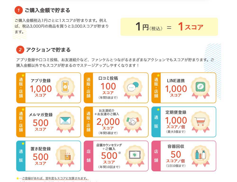 購入金額(1円=1スコア)に加えて、アプリ登録(1000スコア)やLINE連携(1000スコア)、口コミ投稿(100スコア)、さらには容器回収(50スコア)といった多様なアクションをスコア化。