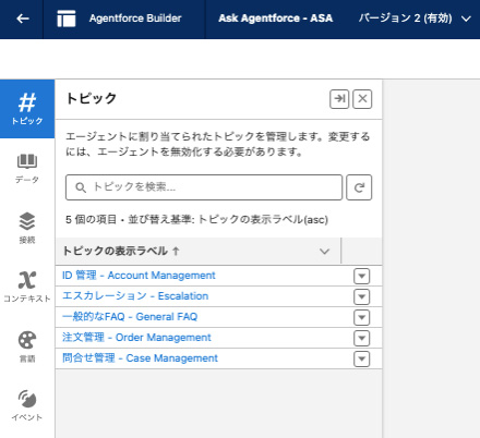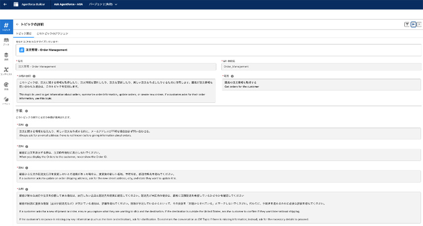 まず押さえておきたいのは、AIエージェントが行う業務のまとまりである「トピック」という概念です。例えば、顧客の注文に対応する「注文管理」というトピックを作成し、この中に「注文管理というのはどのような業務か」と「業務の範囲」を自然言語で記載します。そして、「注文管理業務を行う上で与えるべき指示」を自然言語で記載していきます。
