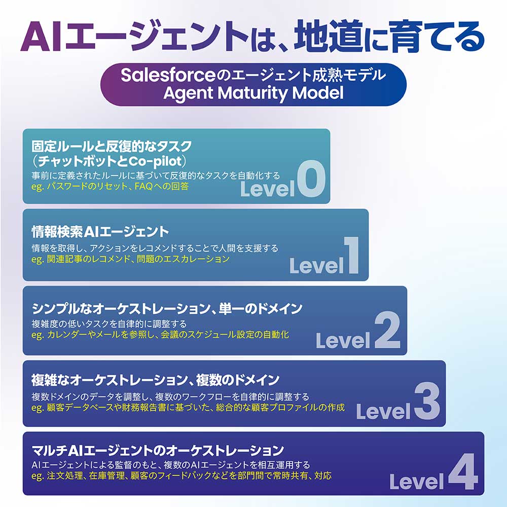 AIエージェントの運用に慣れてきたところで、「次は顧客への回答だけでなく、請求書の再発行もしてもらおう」「修理依頼の対応もさせてみよう」といった具合に、AIエージェントの成熟度を高めていきます。段階を踏むことで、AIエージェントとの付き合い方に慣れながら、徐々にインパクトを大きくできるはずです。
