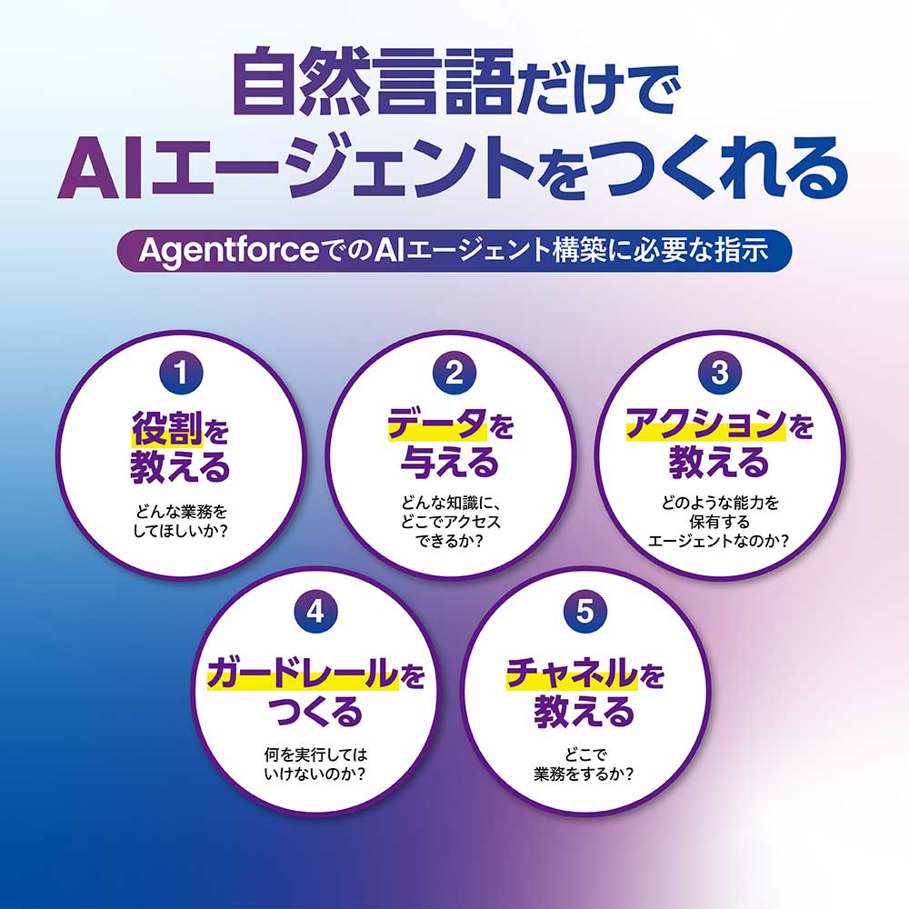 このように、Agentforceでは業務の役割と手順、アクション、使えるデータを自然言語で書いていくことで、AIエージェントをつくることができるんです。