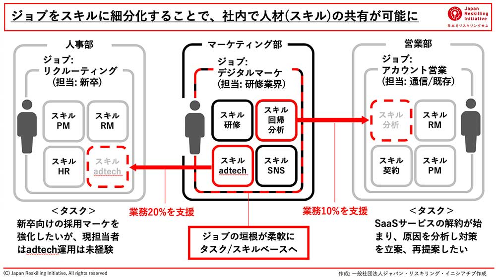 これまでのジョブで定義された「マーケティング部門のAさん」という定義から、Aさんは自身が持つスキルの集合体として社内で認知され、色々な仕事で活躍できるようになります。そうすると報酬面でも「Skill-based Pay」という形で、ジョブではなくその人のスキルの対価として適切な金額が支払われます。