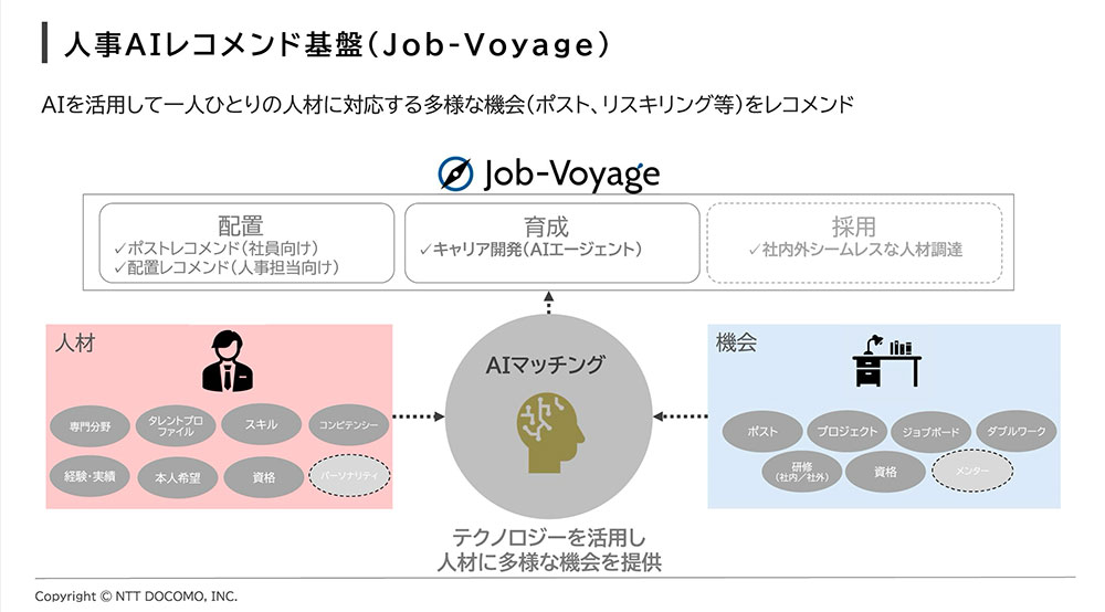 NTTドコモです。同社が開発した⼈事AIレコメンド基盤「Job-Voyage」という社内システムは、まさにスキルベース組織の思想を具現化したものです。