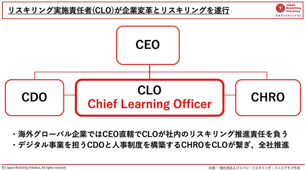 一方で、人材育成の側面では「チーフ・ラーニング・オフィサー(CLO)」という役職も一般的に広がってきています。これはリスキリングのトップとも言える存在です。