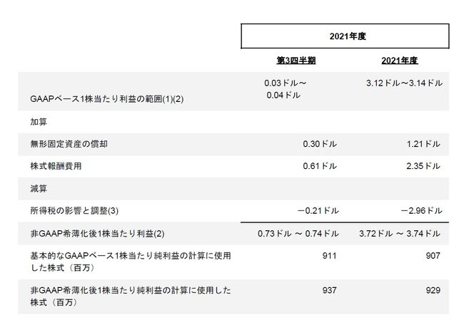 次の表は、2021年度第3四半期および2021年度通期のGAAPベースの希薄化後1株当たり利益を、非GAAPベースの希薄化後1株当たり利益のガイダンスに調整したものです。