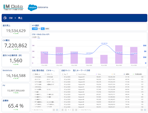 エム・データの「TVメタデータ」は、テレビ番組・テレビCMの放送実績を100名超の専属スタッフが24時間/365日、独自の方法でサマライズし記録(TVメタデータ化)したデータベースです。「いつ」「どこで」「何が」「どのように」「どの程度(何秒間、何回)」放送されたのかを、独自のデータ収集システムを使用し関東・中京・関西・BS局のデータの生成を行っています。このエム・データの「TVメタデータ」とDatoramaが連携することにより、テレビ広告や番組露出の直後一定時間内に、Webの検索数やセッション数と重ねて、スポットCMやパブリシティの効果やリフト値を可視化することができるようになります。