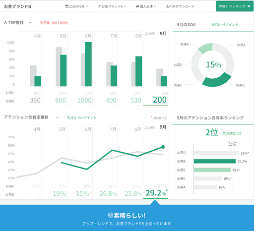 加えて、競合ブランドのテレビ広告の放映時間や長さ、番組カテゴリー等も分析できるため、競合のターゲティング戦略やポジショニング、SOVを理解した上でのマーケティング戦略を立案することも可能となります。