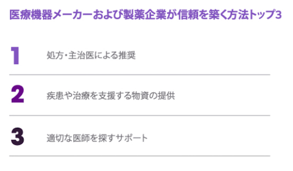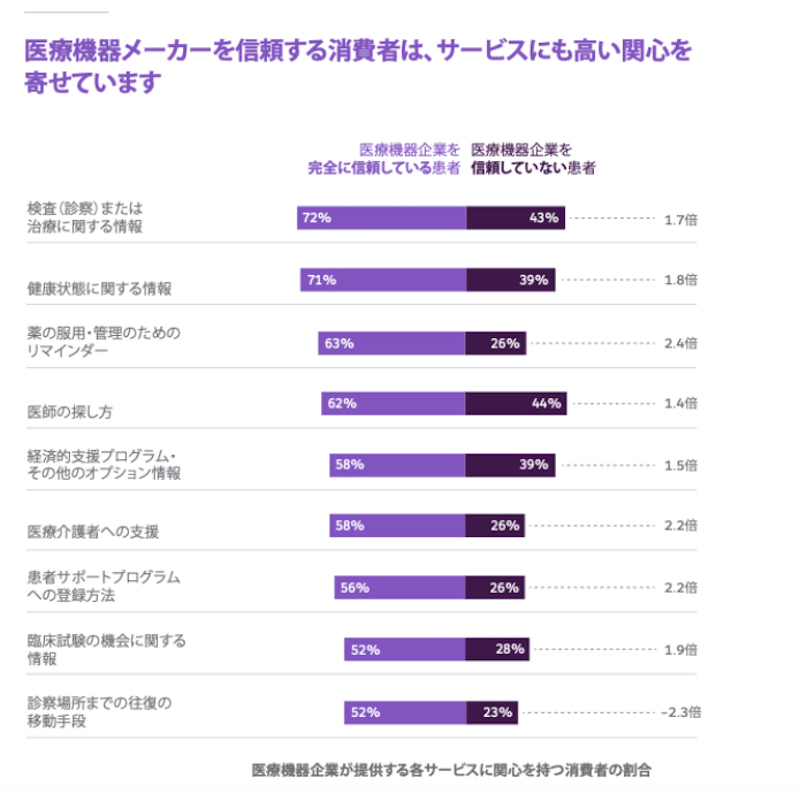 例えば、消費者が医療およびライフサイエンス企業と関わる機会が多いほど、サービス利用への関心度が高まります。「医療機器メーカーを完全に信頼する」 と回答した消費者は、「医療機器メーカーを信頼しない」と回答した消費者に比べて、患者サポートプログラムの登録方法に関する情報を求める可能性が2.2 倍高くなります。