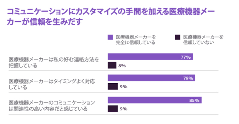 信頼されるヘルスケア企業の最も大きな特徴として、カスタマイズされたサービスを提供する点があげられます。ヘルスケア企業を信頼している消費者は、ヘルスケア企業を信頼していない消費者に比べて、多くのパーソナライズされたリソースとコミュニケーショ ンを受け取っています。実際、医療機器メーカーを信頼する消費者は、医療機器企業を信頼しない消費者と比べて、カスタマイズされたメッセージを受け取っている可能性が8倍であることが分かっています。