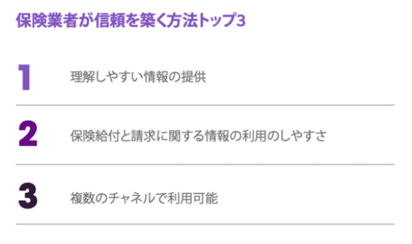 保険業者:消費者は理解しやすい情報とアクセスのしやすさを求めています。調査対象のおよそ半数は補償範囲を把握できておらず、また保険会社との不必要なやり取りが発生していると回答しています。信頼を築くために、利用しやすく分かりやすい情報を消費者が好むチャネルで提供することが必要です。