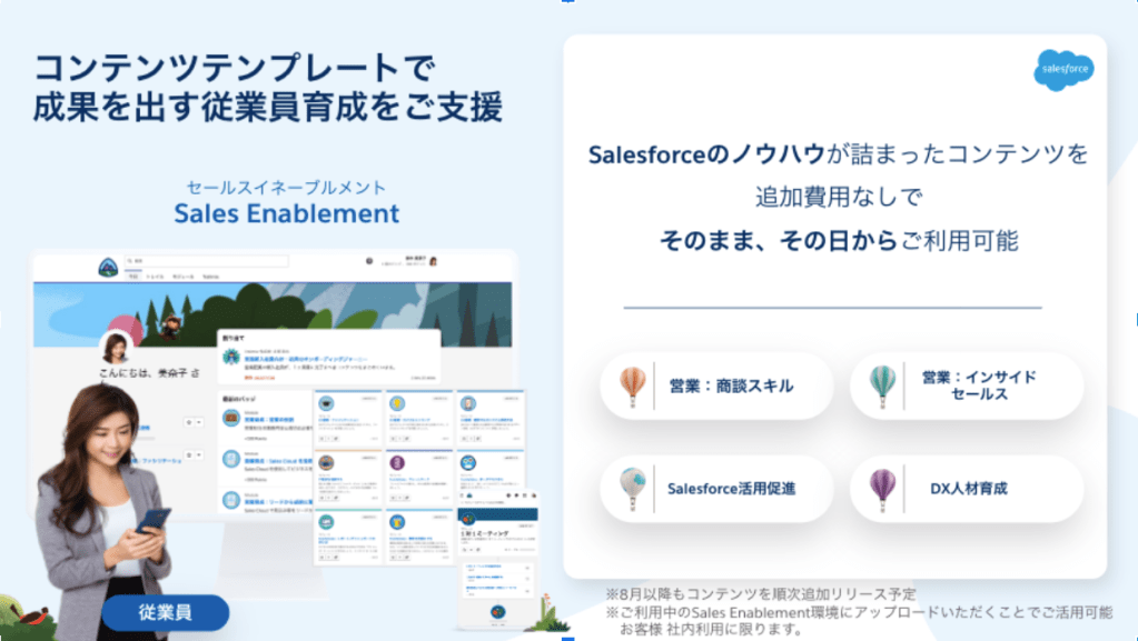 Sales Enablement(旧名称:myTrailhead)は、従業員オンボーディングの強化、Salesforceユーザーの定着化、生産性の飛躍的な向上、企業文化の醸成のための学習プラットフォーム(製品)です。これまで本製品は、顧客独自の社内資料や情報をまとめてコンテンツを作成することで社員教育に効率的に取り組むことが可能でしたが、一方で、Salesforceの営業ベストプラクティスについても学びたいという声も多くありました。