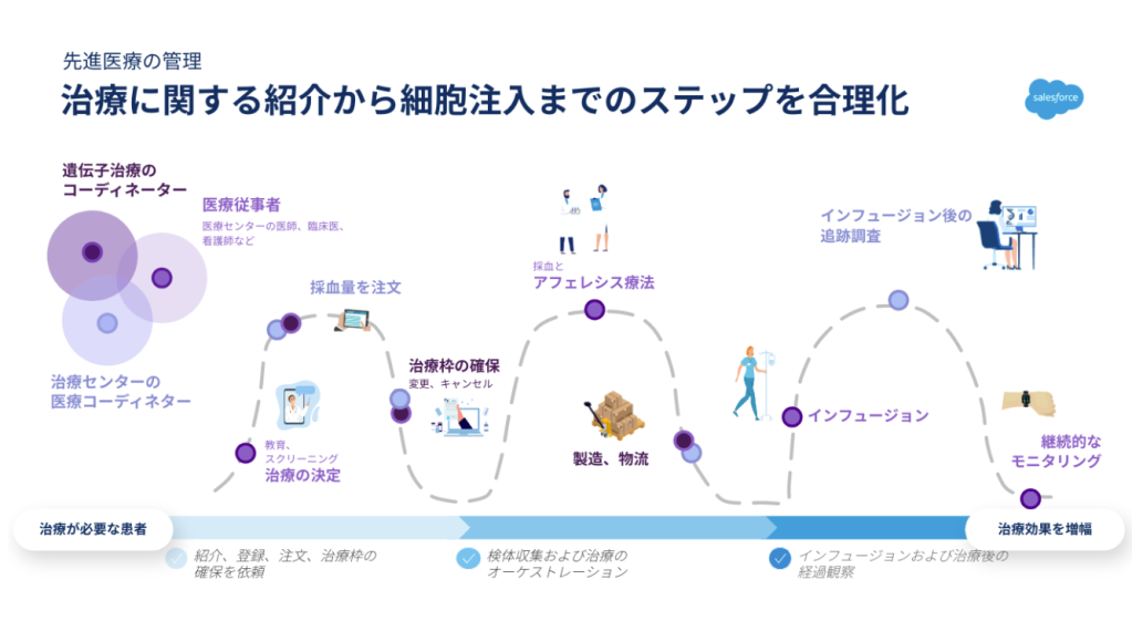 SalesforceのAdvanced Therapy Managementは、医療機関、製造委託先、物流業者、製薬会社の一連の業務をシームレスに統合し、単一のデジタルプラットフォーム上で、製薬会社が複雑なプロセスを管理し、個別化治療を患者さんに提供できるようにします。