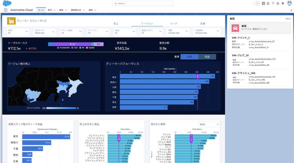- Dealer Performance Management(ディーラーパフォーマンスマネジメント):地域別のディーラーの業績を簡単に分析し、リードのパイプラインを把握することができます。これにより、自動車メーカーとディーラーが共通の目標を設定し、販売計画、現地への訪問、パートナーとの連携、需要予測、チャネルインセンティブなどをより適切に管理、調整することができます。