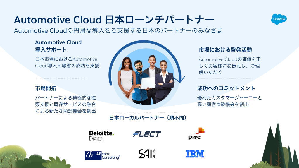 Salesforceには、自動車業界に関する独自の専門知識とソリューションを提供する広範なパートナーエコシステムがあります。Salesforceではパートナーと共に、日本でのAutomotive Cloudの円滑な導入と顧客の成功を実現してまいります。