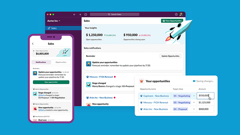 • Slack Sales Elevateは、Sales Cloudをネイティブに統合し、パイプラインの更新、リアルタイムのデータ確認、通知への対応をSlack上で直接対応可能にします。