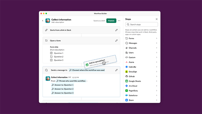 • 新しく改良されたワークフロービルダー:どなたでもノーコードで業務を自動化できるようになりました。Google、Atlassian、Asanaなどの企業から提供されるコネクタを利用して、数クリックで複数のツールを1つのワークフローに統合できます。ワークフロービルダーは、Salesforce Flowにも対応しており、管理者が承認したSalesforceの自動化機能を使用して、安全にSlackのワークフローをカスタマイズできるようになりました。
