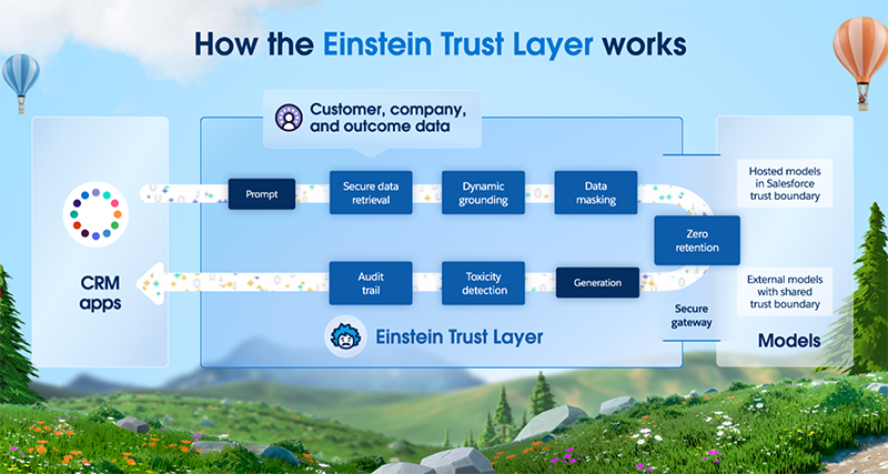 • 連携とグラウンディング:Trust Layerは、デフォルトですべてのEinstein Copilotに組み込まれており、Salesforce Data Cloudとの連携を通じて、信頼できる企業データの基礎となり、生成プロンプトを強化します。