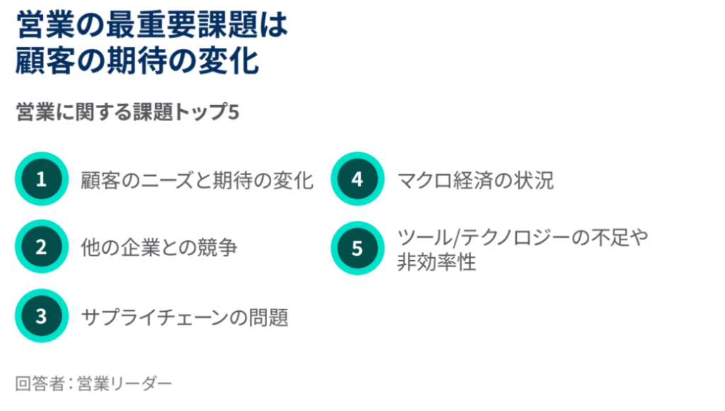 - 顧客の期待に応えるための時間の確保に苦慮する営業担当者:変化する顧客の期待に対応することは、営業活動における全世界的に大きな課題のひとつとなっています。しかし、営業担当者は営業活動に費やす時間の確保に苦労しています。
