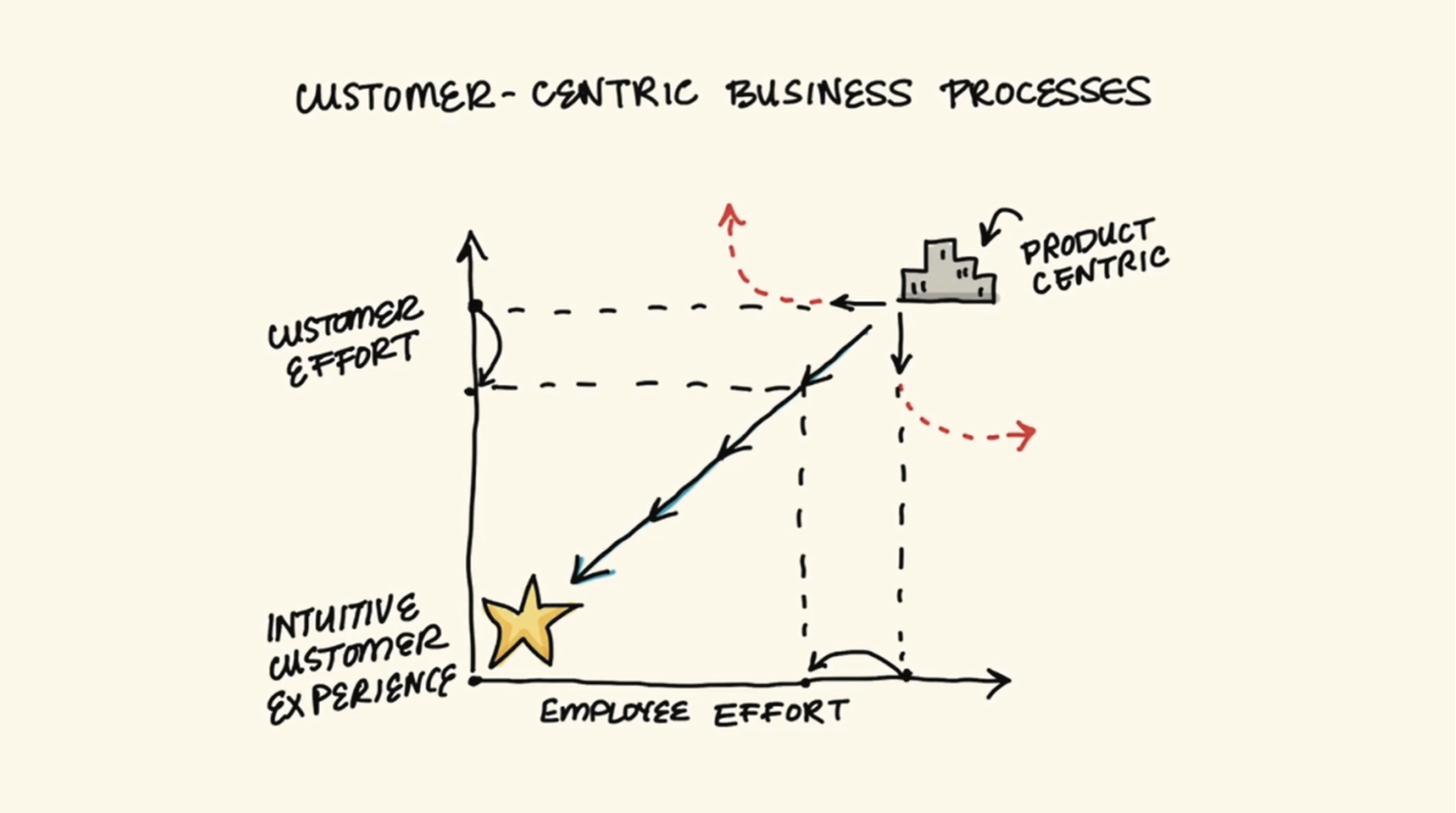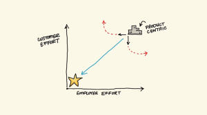 상기 이미지에서 가로축을 ‘임직원들의 노력’, 세로축을 ‘고객의 노력’이라고 했을 때, 대부분의 기업들은 해당 도표의 우측 상단에 위치하고 있습니다. 바로 제품 및 서비스 중심의 기업들인 것이지요. 그러나 이러한 환경에서 업무를 수행하는 임직원들은 고객접점에서 발생하는 데이터를 파악하기 매우 어려우며, 여타 부서와 협력하는 것에도 어려움을 겪습니다. 이에 따라 임직원도 그리고 고객들도 필요한 리소스 이상의 시간과 에너지를 할애하는 노력과 희생이 뒤따르게 됩니다.