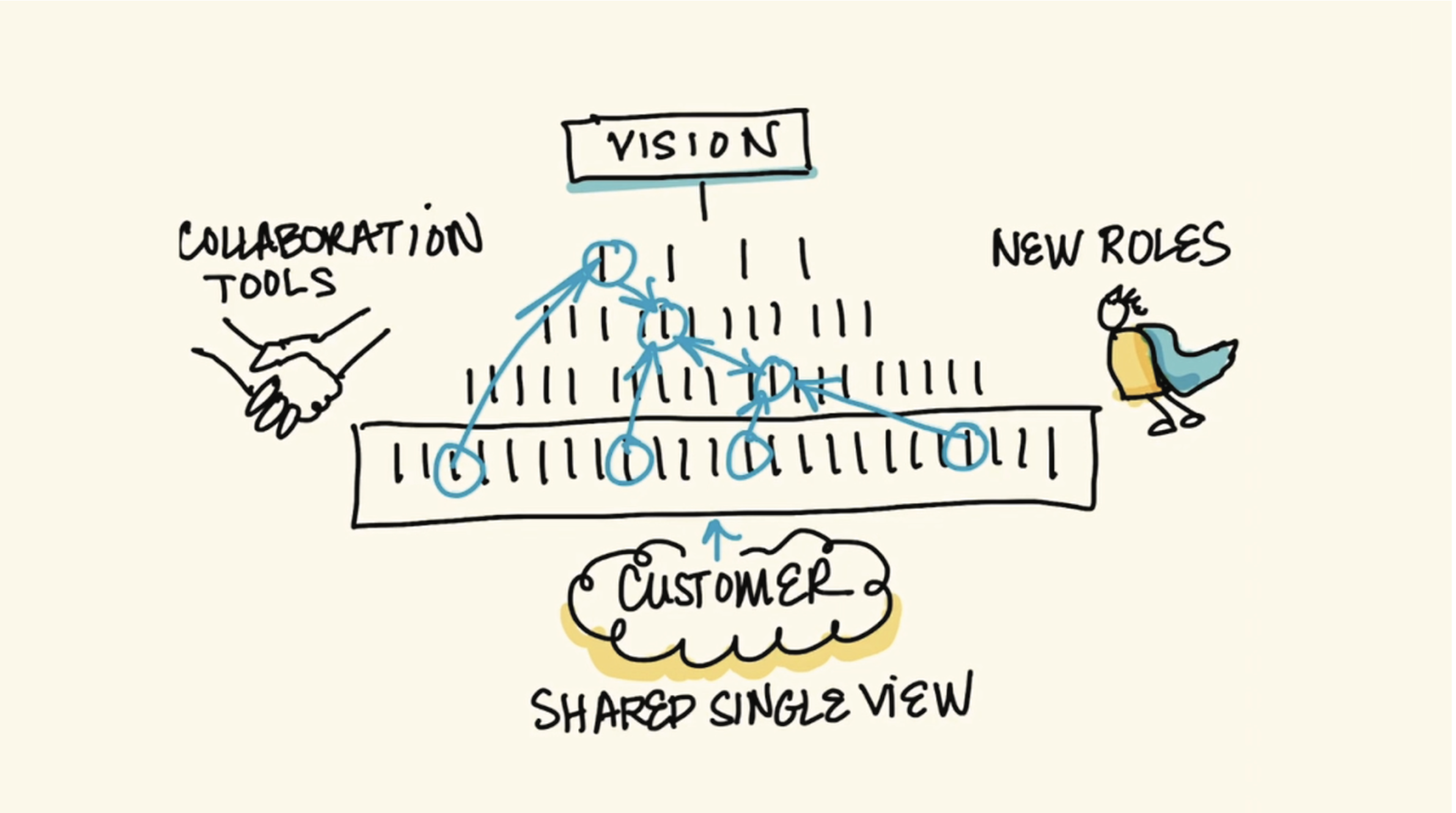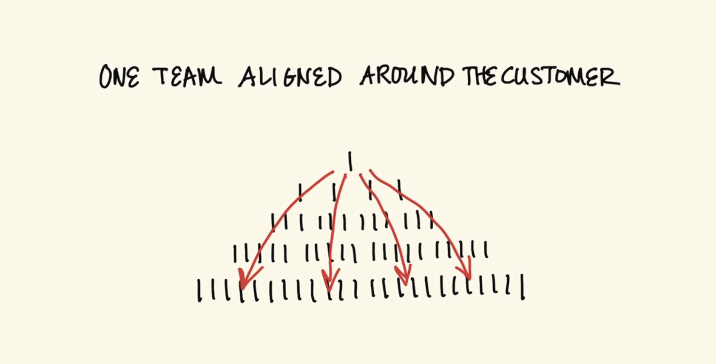 기존의 제품 중심의 기업들은 대부분 ‘Top-Down’ 방식의 수직적 조직구조로 구성되어 있습니다. 그러나 고객이 중심이 되어야 하는 현 시점에서는 이러한 모델의 조직구조는 더이상 적절한 역할을 수행하지 못합니다. 그 이유는 고객과 가장 가까운 곳에 위치한 직원이 조직의 가장 하단부에 위치해 있기 때문입니다. 특히 이들이 기업의 최전선에서 확보한 피드백은 그 어떤 자산보다 소중한 데이터이며, 이를 유의미하게 여기지 않는다면 성공적인 혁신에는 어려움을 겪게될 것입니다.