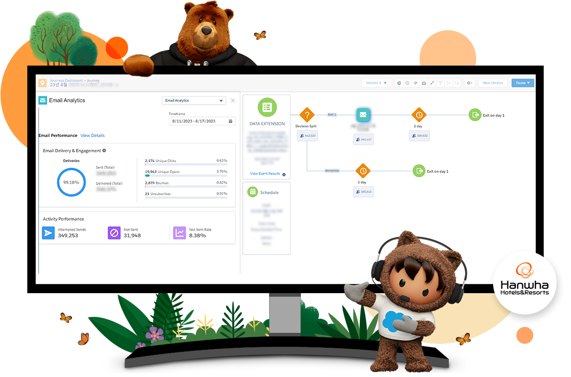 또한 데이터 기반의 마케팅 캠페인도 용이해졌습니다. 커스터머 360을 이용해 통합적인 고객 데이터를 한눈에 확인할 수 있기 때문에 한화호텔앤드리조트는 갑작스러운 변동이 생길 경우 이를 트래킹할 수 있는 역량과 마케팅 캠페인 이후 오픈율, 클릭율과 같은 주요 성과 데이터를 실시간으로 확인 및 분석할 수 있는 역량을 확보했습니다. 이에 따라 데이터를 축적할수록 보다 나은 의사결정을 수립해 나가며, 고객성공을 위한 여정을 지속해 나가고 있습니다.