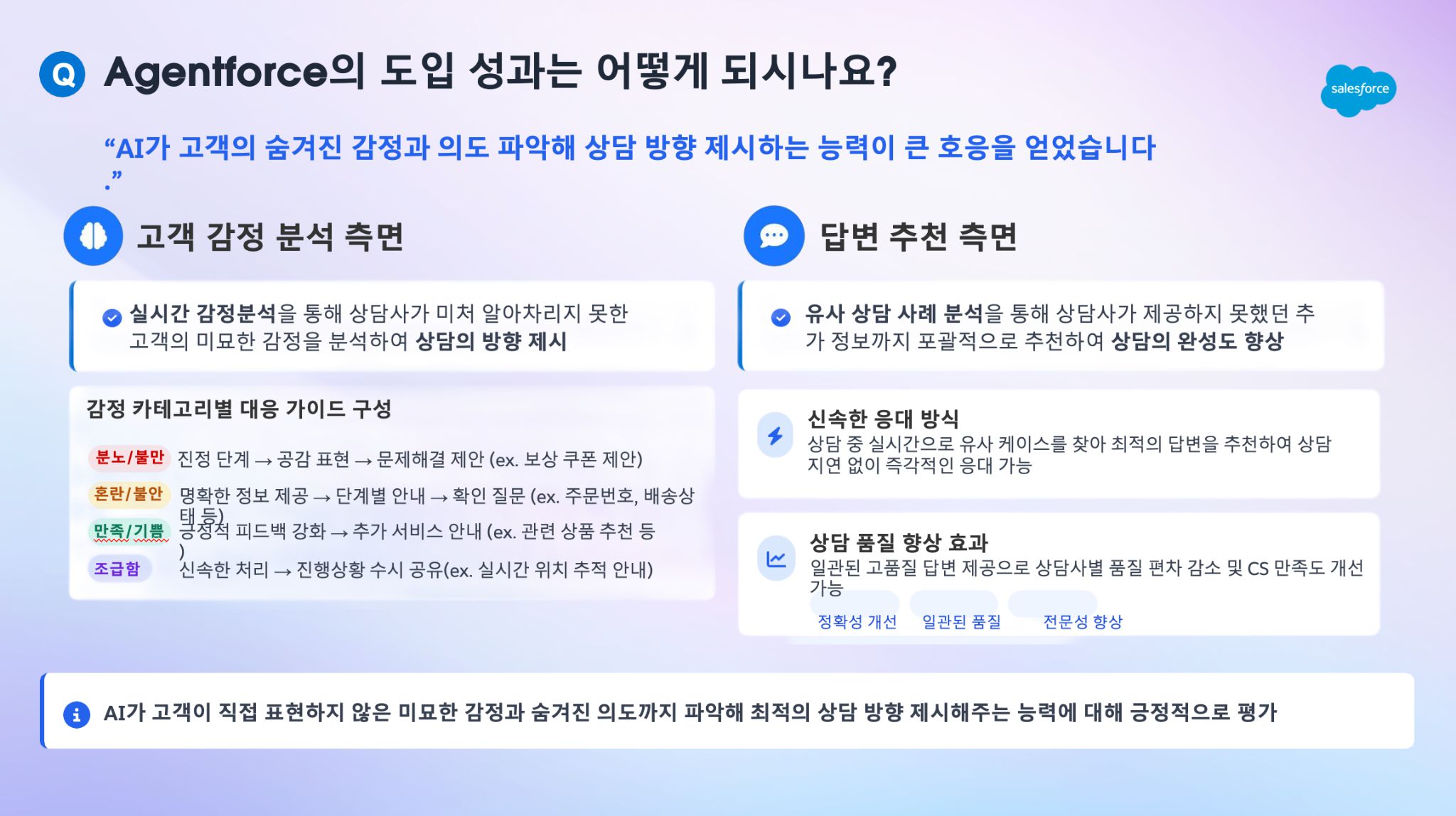 Agentforce를 통해 보여준 다양한 기업의 사례는, AI가 더 이상 거창한 전략의 일부가 아니라 지금 이 순간, 매장과 콜센터, 데이터 분석 현장에서 이미 활용되고 있는 실용적인 솔루션임을 보여 주었습니다.