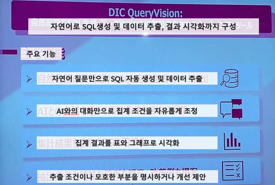 이온 그룹 산하 '이온 데이터 혁신 센터'에서 개발한 데이터 분석 솔루션입니다. 복잡한 SQL 없이도 자연어로 질문만 하면 데이터를 간편하게 추출할 수 있는 것이 특징입니다. 예를 들어, “도쿄에서 가장 많이 팔린 우유 TOP3는?”, “A지점 주요 고객 연령대는?” 등 질문만으로 데이터를 손쉽게 추출할 수 있습니다.