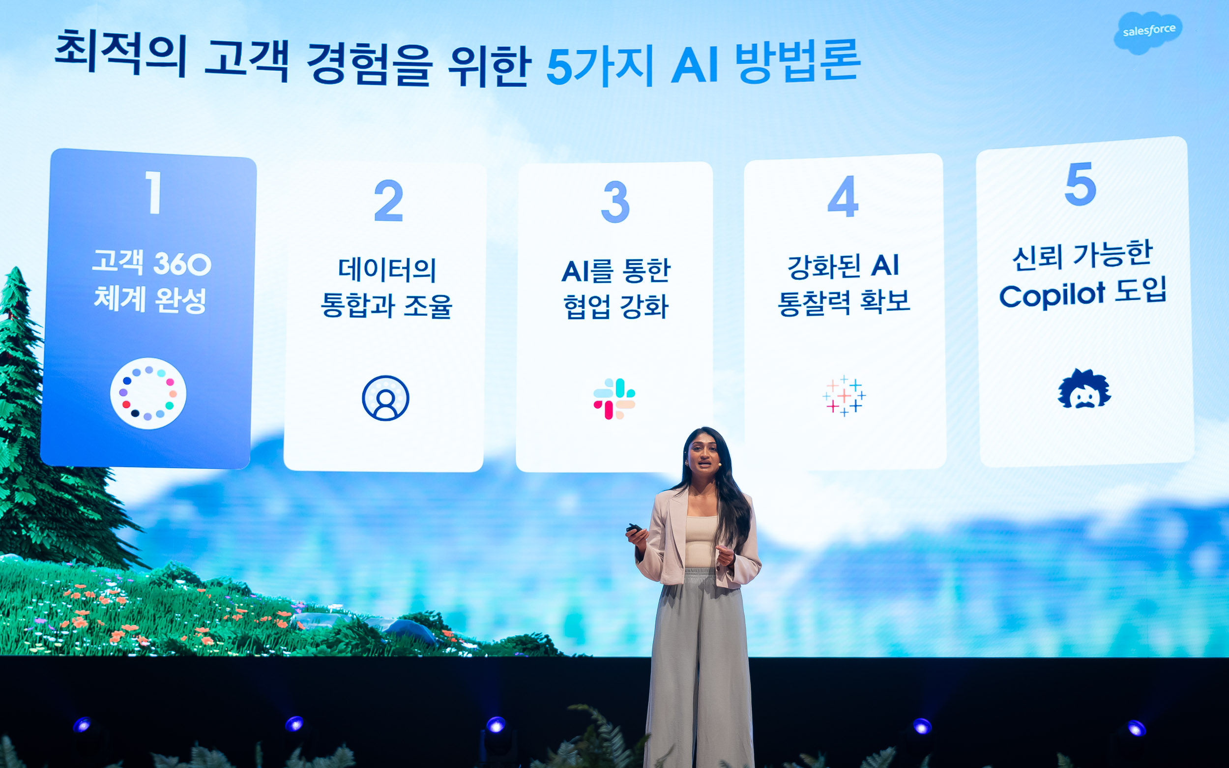 지난 25년 동안 전 세계 기업들과 함께 디지털 혁신 노하우를 축적해 온 세일즈포스는 이번 월드투어 코리아에서 ‘고객경험 혁신을 위한 5가지 AI 방법론’을 소개했습니다. 이날 세일즈포스는 △커스터머 360 체계 완성 △데이터의 통합과 조율 △AI를 통한 협업 강화 △강화된 AI 통찰력 확보 △신뢰 가능한 코파일럿 도입 등을 기반으로 기업이 AI를 통해 차별화된 고객경험과 직원경험을 제공할 수 있어야 한다고 설명했습니다.