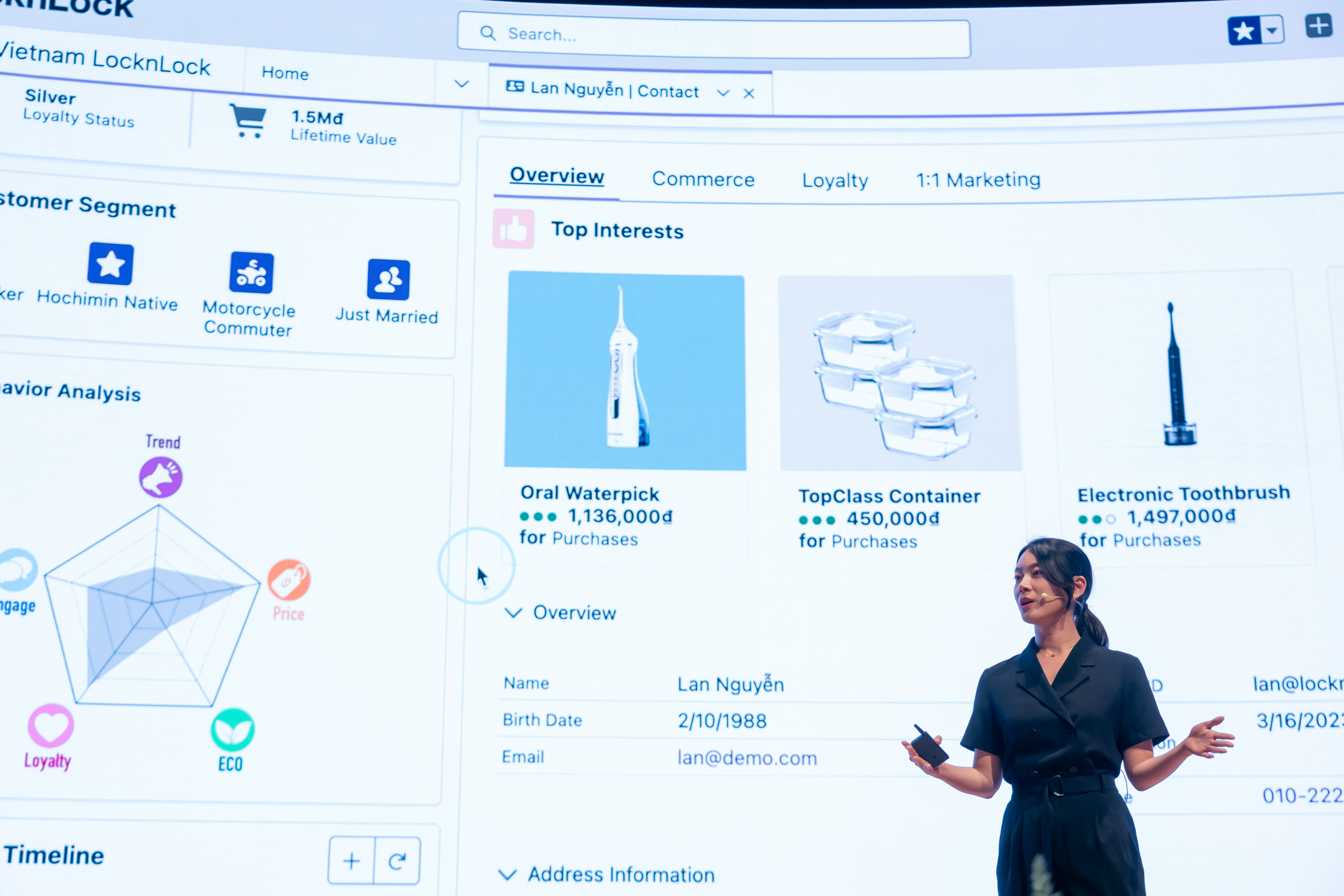 락앤락의 라이브 데모 시연에서는 베트남의 여름을 맞아 아이스 베버리지웨어 캠페인을 준비하는 마케터의 사례가 참가자들의 이목을 집중시키기에 충분했습니다. 마케터는 태블로를 활용해 지역과 고객 행동 데이터를 분석하여 적절한 타겟 세그먼트를 도출하고, 마케팅 클라우드와 아인슈타인 AI를 활용하여 마케팅 캠페인을 진행했습니다. 이렇게 도출된 타겟 세그먼트가 제품을 접하고 구매하기까지의 과정을 일관성 있게 경험할 수 있도록 커스터머 360을 활용하여 고객 맞춤형 응대를 제공하였습니다. 이렇게 락앤락은 세일즈포스를 활용해 마케팅, 커머스, 서비스 업무를 처음부터 끝까지 연결시키고 아인슈타인 AI를 통해 이 모든 과정을 더욱 편리하고 스마트하게 처리할 수 있었습니다.