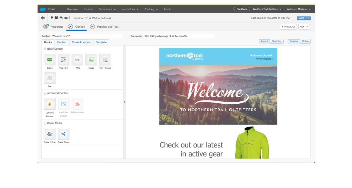 Use prebuilt content blocks to create sophisticated, dynamic content based on a customer’s behavior and attributes. Use additional content blocks to integrate your strategy and engage subscribers on social or across the Web.