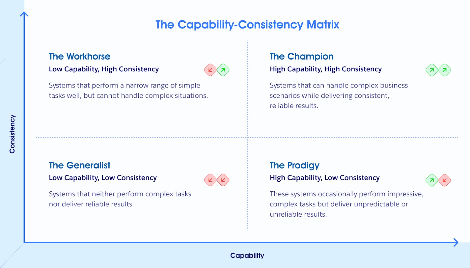 eVerse addresses this by moving agents along both dimensions simultaneously. Generic LLM agents underperform in business settings—high capability but low consistency creates the “prodigy” problem: brilliant when it works, unreliable when it matters. eVerse-trained agents achieve the “champion” quadrant: high capability combined with high consistency, exactly what enterprises require.