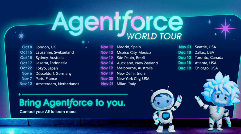 Salesforce is extending the Agentforce experience beyond Dreamforce, with over 20 “Agentforce World Tours” scheduled in cities across the globe before the end of the year. These events will offer customers unable to attend Dreamforce the opportunity to build their own Agentforce Agents. See the schedule of upcoming Agentforce World Tours here.